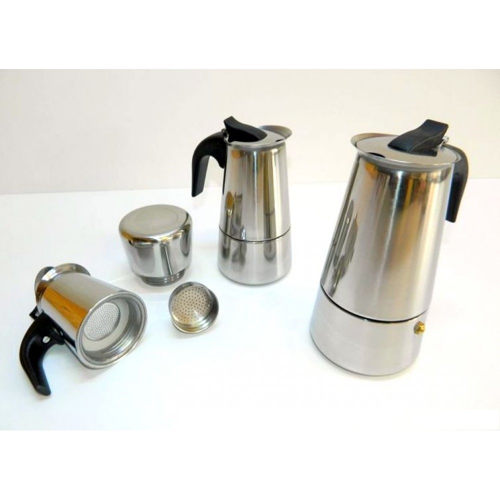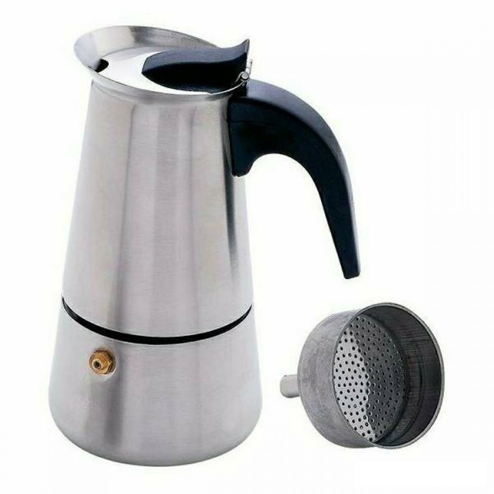 Klasszikus kotyogós rozsdamentes kávéfőző műanyag fekete nyéllel, ami nem veszi át a hőt.